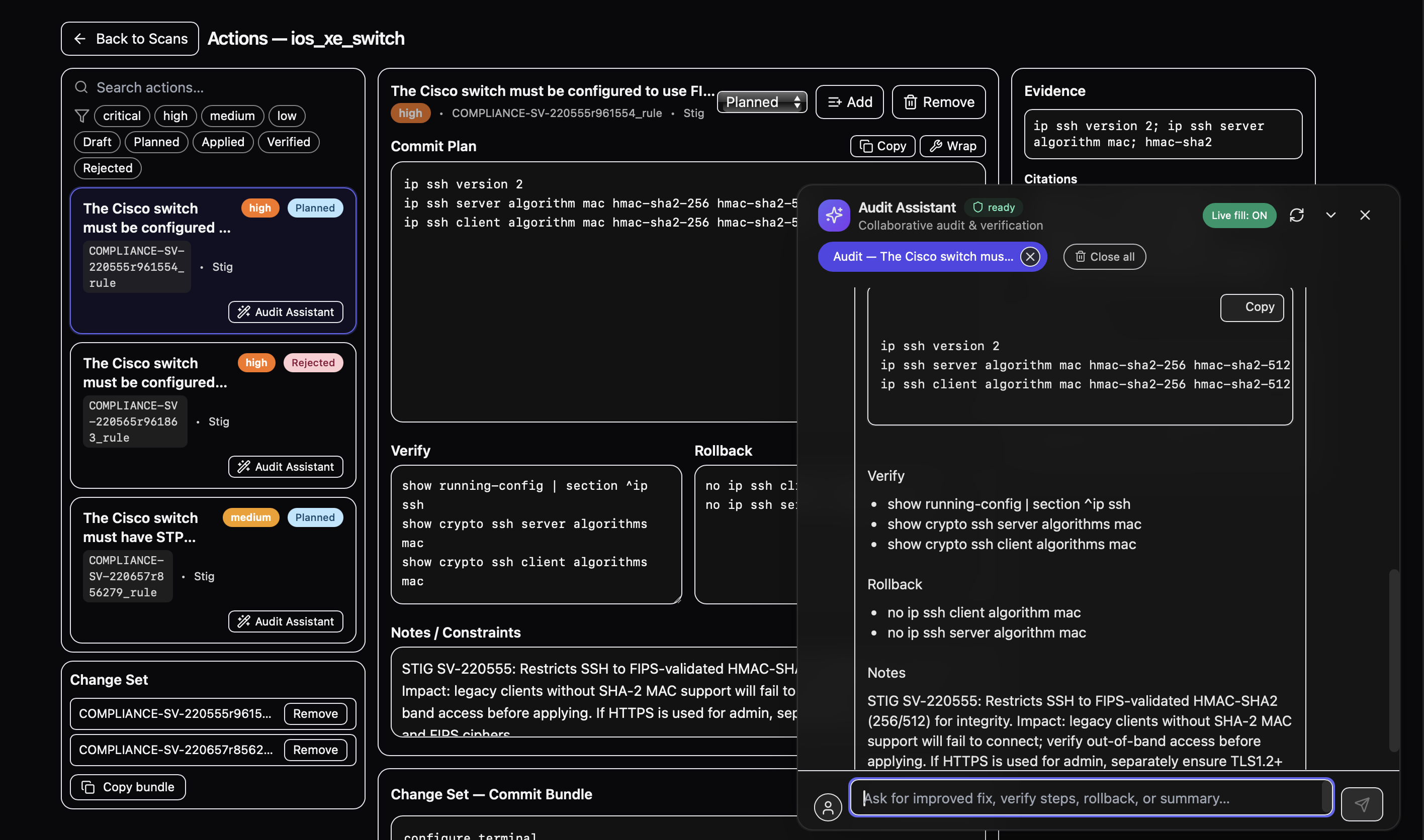 Automated rule packs to validate device configs against rigorous DISA STIG baselines.